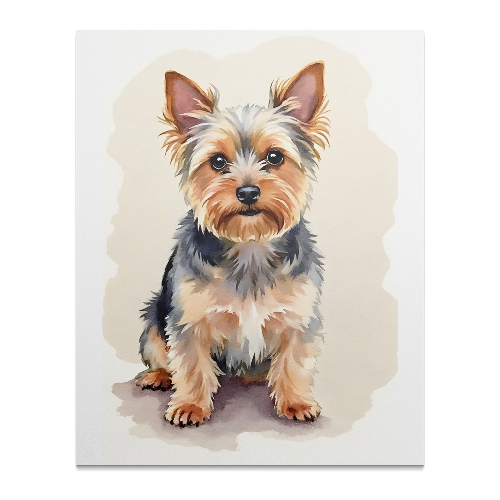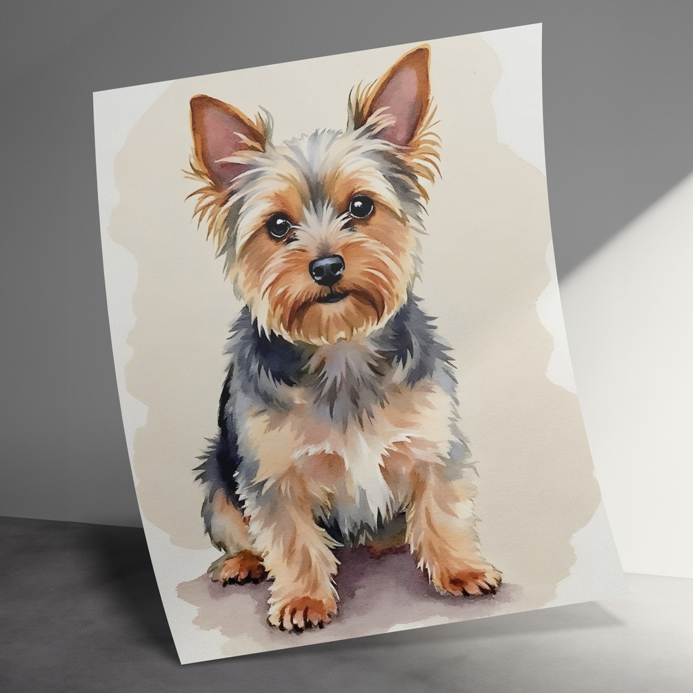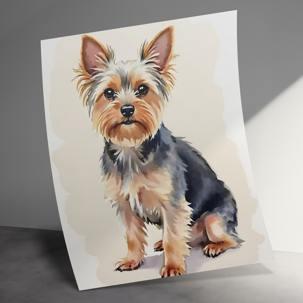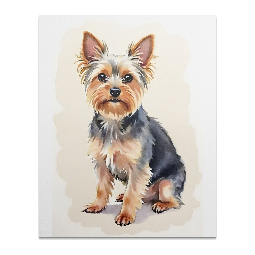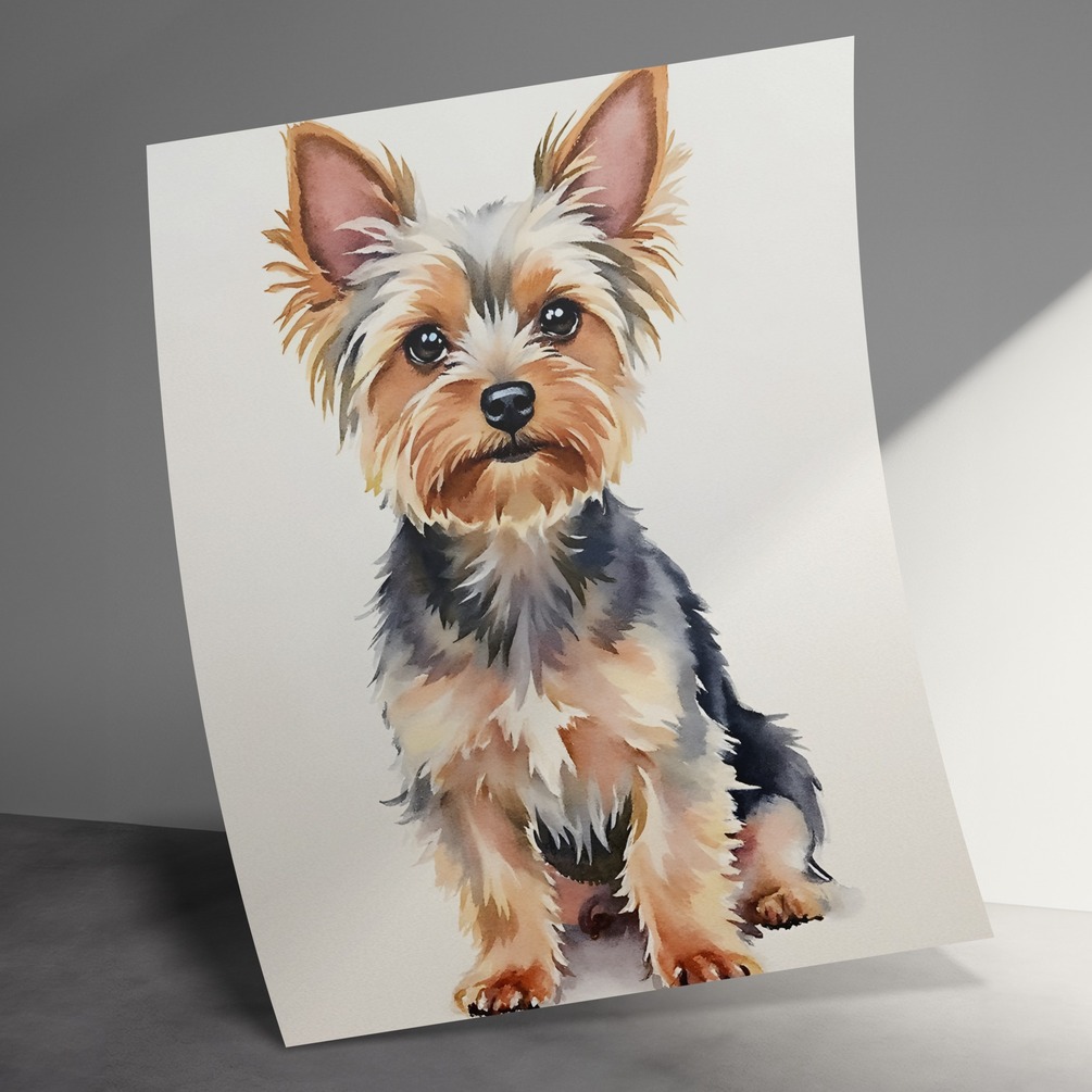 This is a beautiful watercolor illustration of a Yorkshire Terrier, showcasing the breed's adorable features and charming personality. The artwork captures the essence of a Yorkie with its expressive eyes, silky coat, and confident stance.